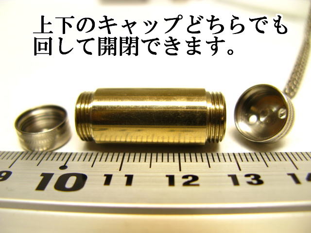 アロマペンダント【香水ペンダント】の仕様【詳細】 サイズ:外径11ミリ 長さ30ミリ(吊下げ金具部除く) 内部サイズ:内径(内側の直径)8ミリ 筒内部の高さ28ミリ 最上部の吊下げ金具(フック部):高さ5ミリ ステンレス製2重管付き (吊下げ金具穴内径3ミリ 2重管内径5ミリ) キャップトップ:穴2つ(香り抜け用)(上向きの穴だから、お肌や衣類に香りが残りません) 重さ(本体):約 11.0g 材質:ハイグレードステンレスJIS規格SUS305(18-10ステンレス) 開閉:ネジ式(ネジのように手で回して開閉するタイプ) 耐久性・耐衝撃性・耐水性を重視したオリジナルです。