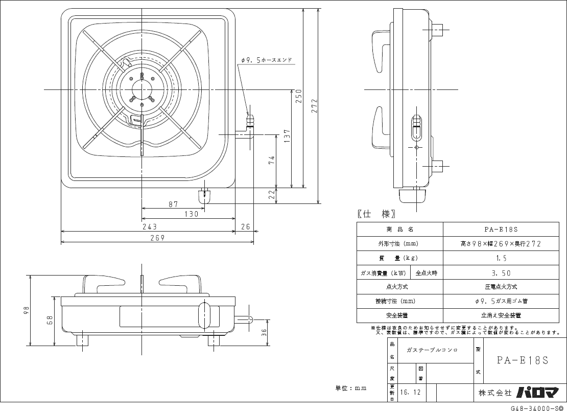 圧電点火方式/立ち消え安全装置付き 仕様 メーカーパロマ 型番PA-E18S トッププレート/カラーステンレストップ/- 外形寸法 [mm]H68(トップ面までの高さ)×W269×D250 質量 [kg]1.5 ガス接続/電源9.5mmΦガス用ゴム管/- ガス消費量[13A:Kw(kcal/h)][LPガス:Kw(kg/h)]3.50/2.95 この商品について接続には、ガスホースが必要です。